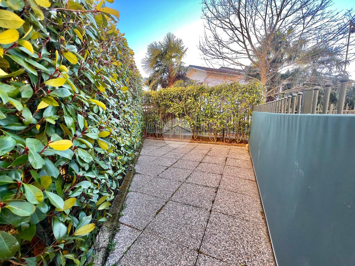 L'appartamento dispone di un disimpegno che conduce a due bagni, uno dotato di doccia e l'altro di una confortevole vasca, offrendo il massimo del comfort e della praticità. Le due ampie camere matrimoniali, entrambe con accesso diretto al giardino, garantiscono un ambiente intimo e riservato.